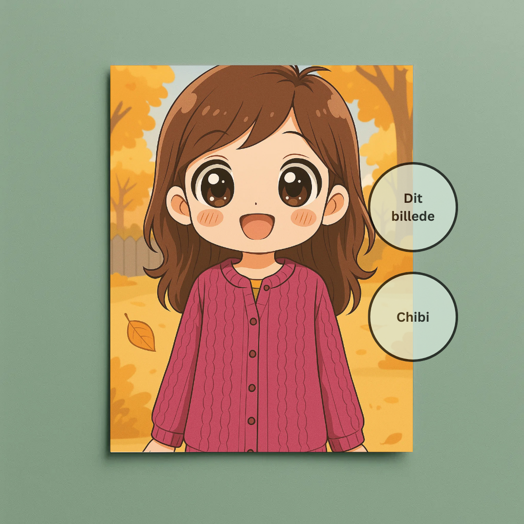 Du vælger bare én af vores 6 sjove og fine styles (f.eks. Chibi, Ghibli eller 2D animation), og så klarer vi resten. Vi laver dit billede i den stil du vælger og trykker det på lækkert, mat papir i høj kvalitet.